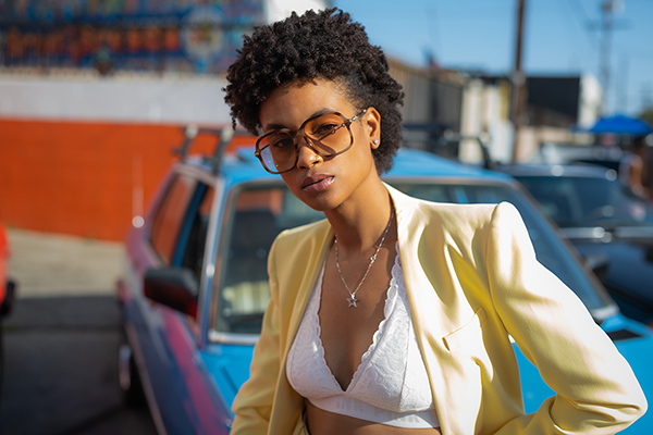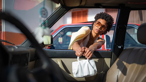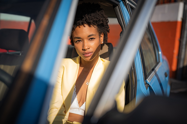 Paul photographed Tyler in the golden light of late afternoon, around 4pm. “With lighter-skinned models, you sometimes have to worry about them blowing out in harsher lighting conditions or getting lost in the environment,” he says. “With darker-skinned models like Tyler, while you definitely see wider latitude in that regard, you have to be cognizant of the sculpting that can occur from the light. For instance, you might get light bouncing off a windshield and producing a highlight around her neck. Once I worked around all of those things, I was very happy with how the 35mm rendered the images.”