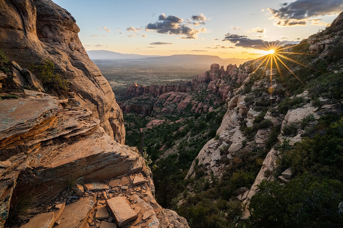 The same applied to my hike in Sedona, where I photographed the sunburst you see here. I definitely hadn’t planned ahead of time to do that—in fact, there’d been harsh lighting all day long, and I wasn’t optimistic on the photos I’d get. But as we hiked to one of the summits, the clouds moved in and an opportunity opened up for me. By capturing the sunburst, it effectively created three layers in the image: the sun-kissed rocks in the foreground, the sweeping green terraces, and then the sunburst that pulls you into the back of the picture.