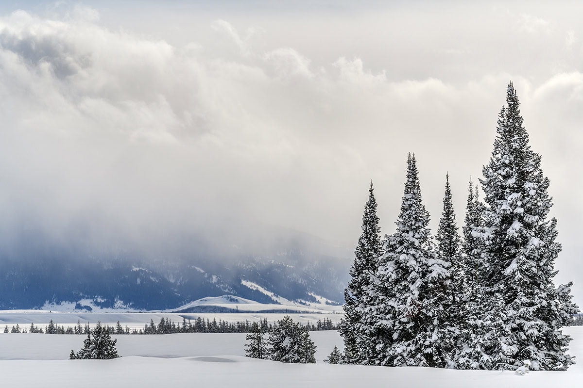 Despite my Ansel Adams leanings, sometimes I’ll feel that a scene calls for some color, especially in bleak winter landscapes. When I spotted this stand of snow-covered trees in Wyoming’s Jackson Hole, in the Grand Tetons, with the mountains obscured by clouds and fog, the dark blue of the mountains contrasted so nicely with the warmer sky touched by the sun. When I flipped it to black and white during the editing process, it didn’t have the same impact as the color version.