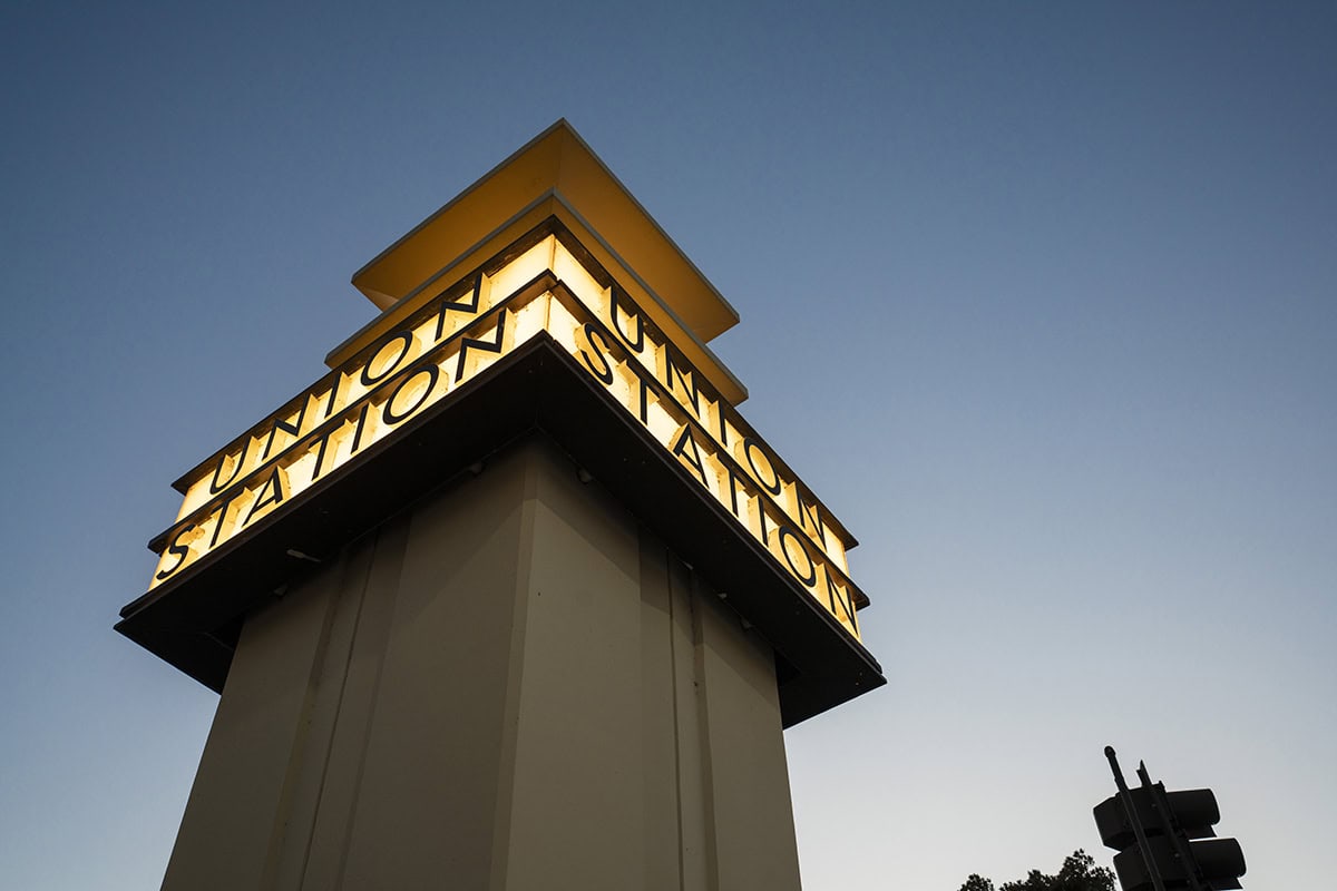 When I spotted that illuminated “Union Station” sign tower outside of the Metrolink depot, it was during one of my favorite times of day: dusk, or the blue hour, when there’s not much color in the sky but it’s not yet completely black. It’s the perfect backdrop for the warm glow of the sign. The Tamron 17-50mm VC performs so well in these low-light conditions.