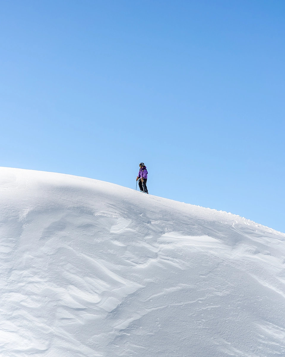For the image you see here of local skier Miles Kemph riding down a near-vertical face, I shot it at 75mm from a high point across the way, almost perfectly at eye level. I love how the angle and the steepness of the face make it appear as if he’s lying sideways—almost like the photo was taken straight down from a drone. It’s also a great example of how the snow can act as negative space. The blank white background naturally pulls your eye straight to the subject.