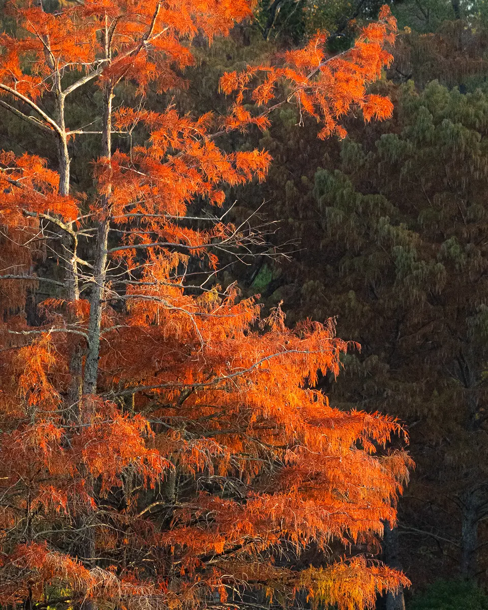Aumente a dramaticidade visual de suas imagens de outono contrastando a folhagem brilhante com áreas sombreadas ou cenários sempre verdes. Uma lente teleobjetiva pode ajudar a comprimir a cena, isolando composições íntimas que enfatizam essa impressionante interação sazonal. Essa técnica não apenas destaca o brilho das cores da estação, mas também simplifica cenas movimentadas, permitindo que formas fortes e diferenças tonais brilhem. Procure focos de luz que destaquem árvores ou galhos individuais e experimente enquadramentos verticais e horizontais para ver qual acentua melhor o contraste. Essas escolhas sutis podem transformar um simples trecho de floresta em uma imagem poderosa e que conta uma história.