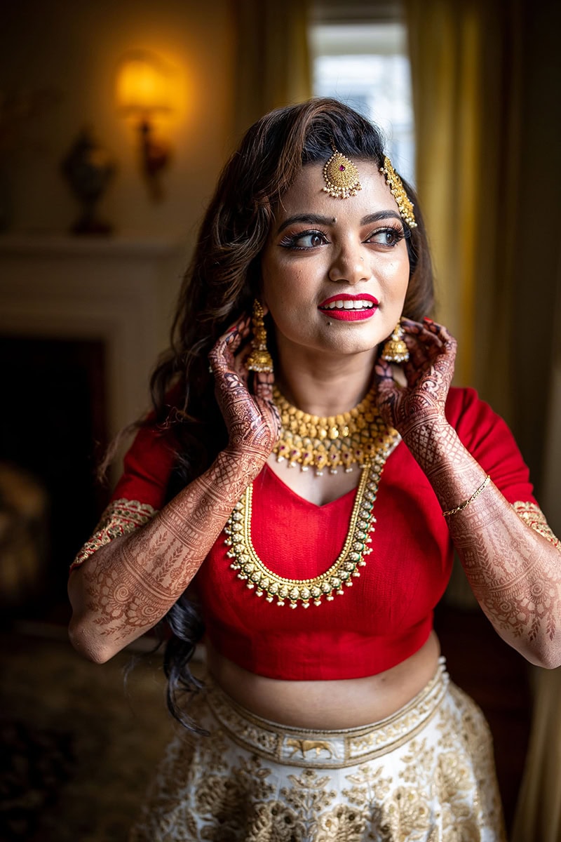 O dia do seu casamento já é estressante o suficiente sem que o fotógrafo gaste muito tempo montando configurações de iluminação elaboradas. Eu tento usar o máximo de luz natural possível. A noiva indiana que fotografei aqui tinha um vestido muito bonito e colorido, e eu queria mostrar os detalhes de suas tatuagens de henna. Eu a coloquei ao lado de uma grande janela para que a luz suave de fora a iluminasse. Gosto do fato de o fundo ter ficado mais escuro, para que ela se destaque na foto.