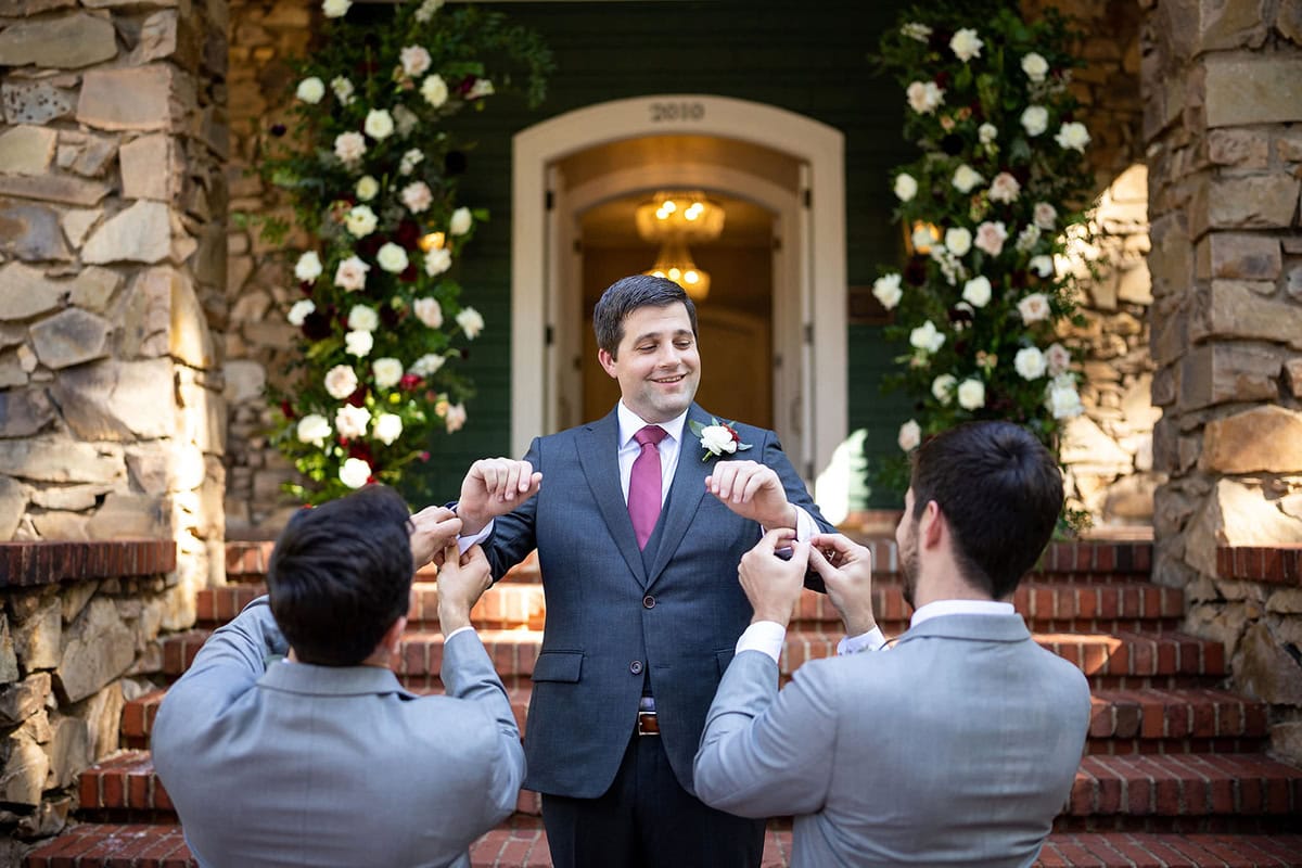 Os homens em casamentos normalmente tendem a ser mais reticentes quanto a serem fotografados. Eu costumo usar mais o humor com eles para conseguir arrancar um sorriso. Nesta foto, o noivo e sua festa de casamento estavam loucos. O padrinho havia trazido uma máquina de Jägermeister e eles estavam se divertindo muito no quarto do noivo no local do casamento. Quando desceram as escadas, o noivo teve dificuldade para colocar as abotoaduras, então pediu ajuda a dois de seus padrinhos. Eles estavam se divertindo muito fazendo isso, e eu comecei a fotografar.