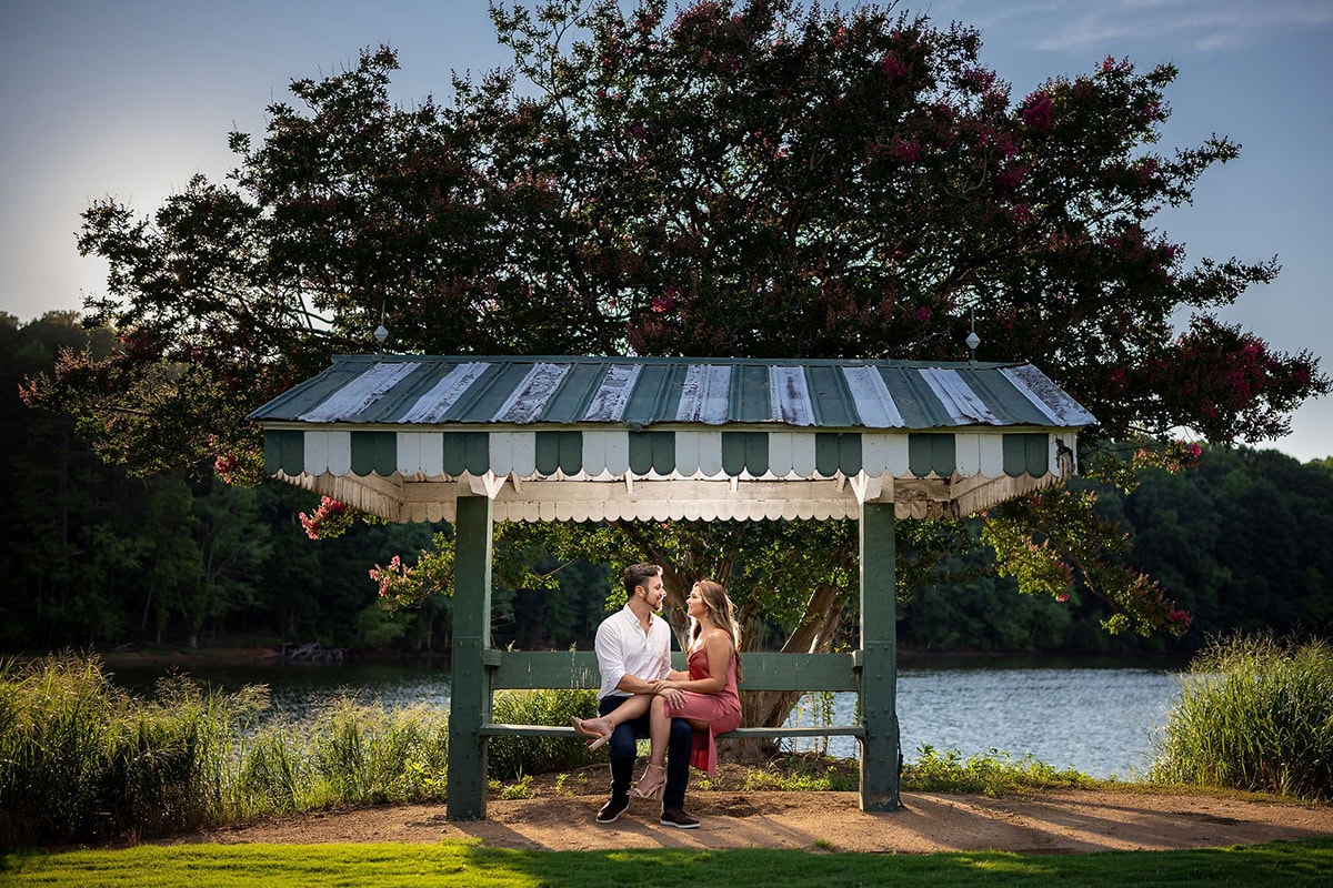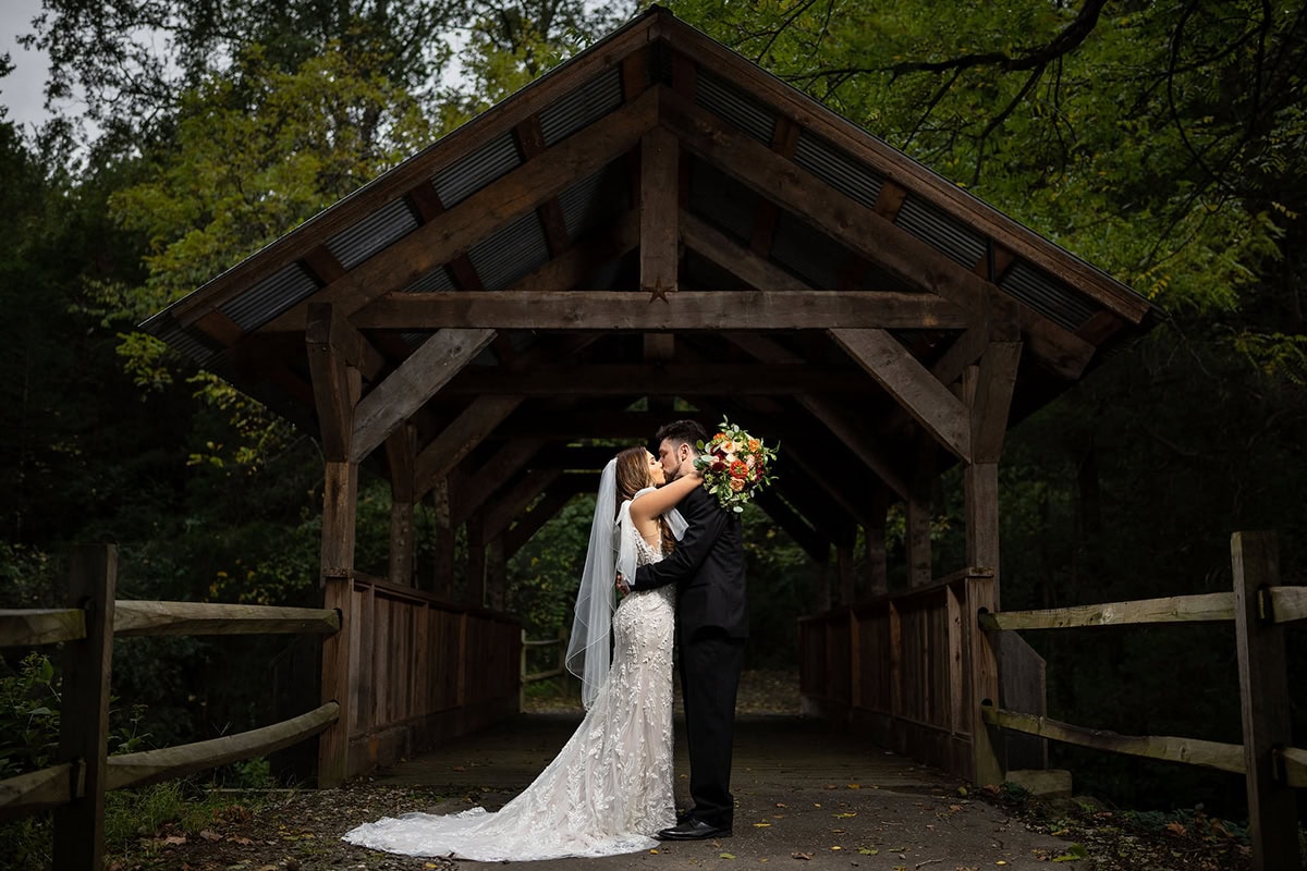 Para o casal no banco, usei um flash com um difusor, coloquei-o atrás deles e o direcionei para cima. A parte inferior do telhado acima deles era branca, então eu sabia que a luz voltaria para eles. Subexpus o céu para que eles se destacassem um pouco mais. Para o casal em frente à ponte, iluminei-os com uma softbox à direita da câmera e depois a removi na pós-produção.