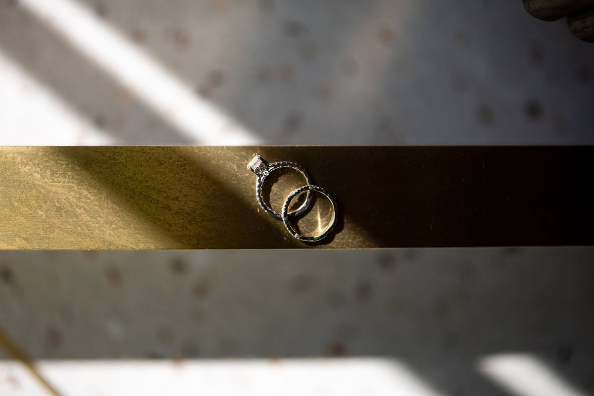 Assim que chego em um local de casamento, procuro a luz forte que entra pelas janelas. Às vezes, esses raios de luz e suas sombras criam formas muito legais. Tirei esta foto das alianças da noiva no saguão do hotel onde ela estava se vestindo. Percebi esse padrão com os feixes de luz diagonais que vinham de uma das enormes janelas do saguão e percebi que poderia colocar as alianças bem no meio disso.