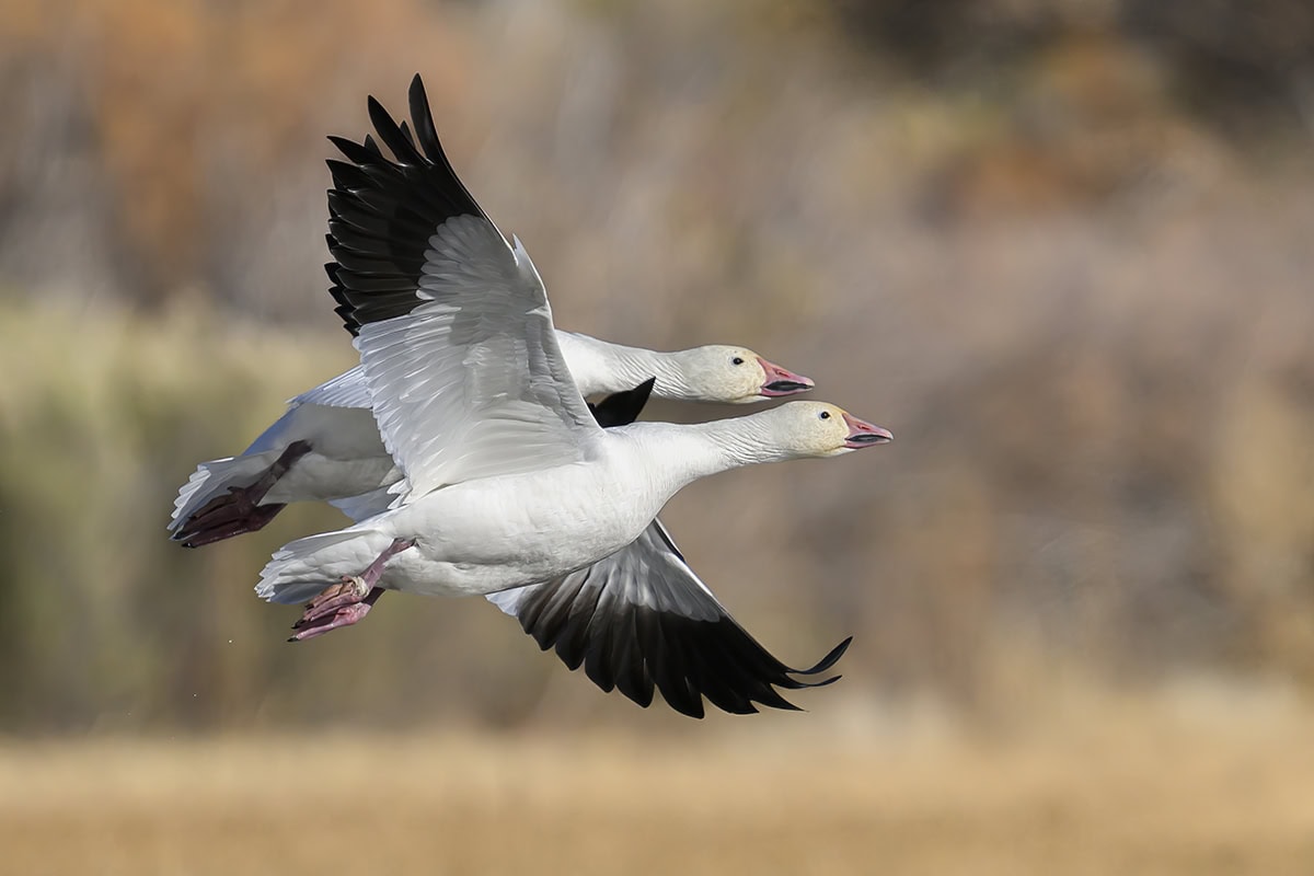 Ao tirar fotos de pássaros em voo, há dois fatores cruciais a serem considerados. Em primeiro lugar, você precisa garantir uma boa iluminação. Para obter uma imagem bem iluminada, posicione-se com o sol atrás de você. Em segundo lugar, você deve ter uma velocidade de obturador adequada. É fundamental lembrar que, ao tirar fotos de pássaros, a velocidade do obturador desempenha um papel tão importante quanto a iluminação. Por exemplo, os gansos da neve podem voar a até 50 mph. Portanto, você deve definir uma velocidade rápida do obturador para capturar essas aves em voo. A foto de um pássaro em voo precisa de uma velocidade rápida do obturador para evitar o desfoque, mesmo das pontas das asas.