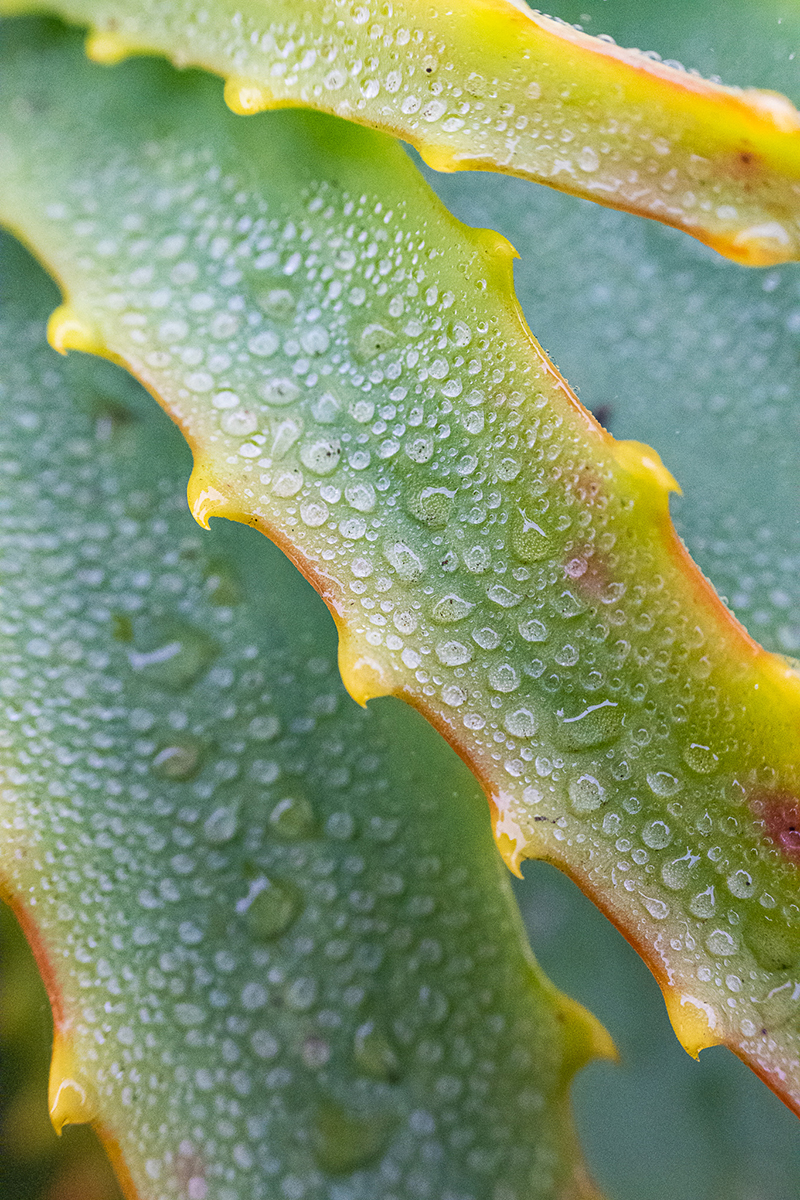 Esta foi uma manhã particularmente enevoada em Monterey. Adorei as cores dessa planta de aloe selvagem, especialmente a maneira como esses pequenos dentes amarelos se destacam da parte verde da planta. A planta também ficou saturada de gotas de orvalho, o que criou os padrões quase lineares que você vê aqui. Se tiver a chance de fotografar flores ou plantas com gotas de água, faça isso. Algumas plantas são bonitas por si só, mas as gotas de água podem transformar radicalmente a aparência de uma planta ou flor em seu quadro.
