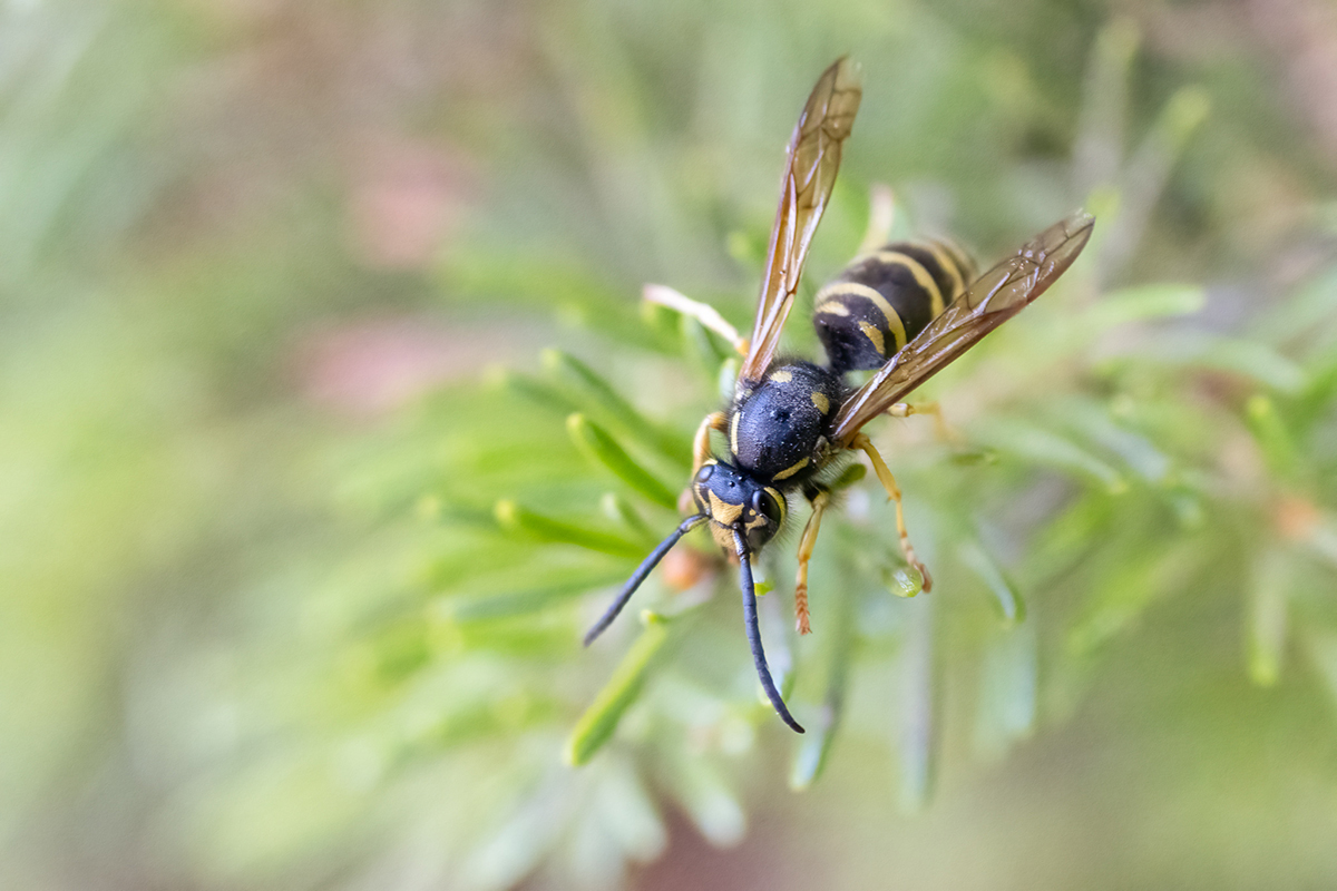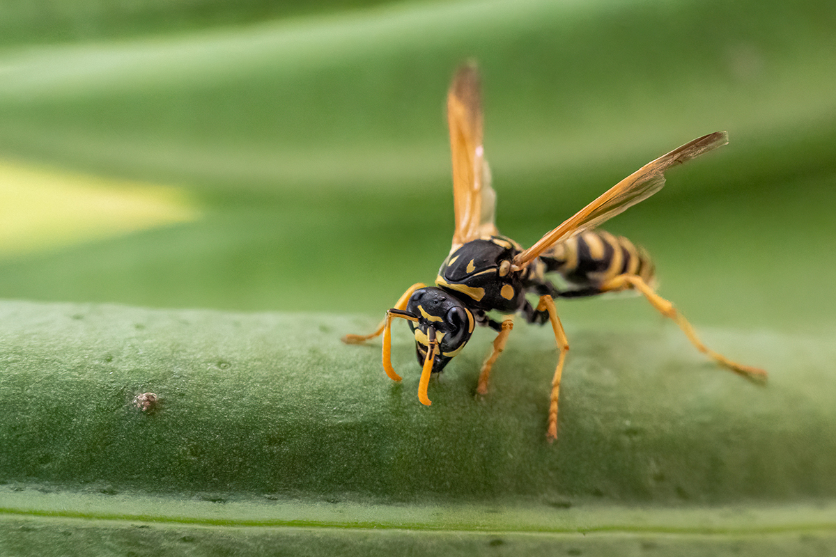 Para a primeira imagem da jaqueta amarela que você vê aqui, eu estava vagando pelas montanhas Wasatch de Utah, procurando as cores do outono para fotografar. Em vez disso, ouvi um zumbido e me deparei com uma colônia inteira de jaquetas amarelas que estavam coletando seiva ou outros açúcares dos galhos sempre verdes. A distância mínima do objeto (MOD) dessa lente é de apenas 9,8 polegadas. Portanto, ao obter fotos macro como essa enquanto fotografa na faixa de 50 mm a 70 mm, o para-sol da lente pode praticamente tocar o objeto. Felizmente, não tenho medo de jaquetas amarelas, e essa foi mais ou menos pacífica.