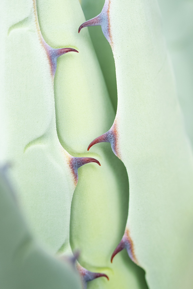 Este é o centro de uma planta de agave, onde as pétalas ainda não se abriram completamente, de modo que é possível ver todas as suas camadas. Fui atraído pela forma como os dentes estavam quase entrelaçados uns com os outros, e como você também pode ver a marca dos dentes de quando a folha foi dobrada. Com uma lente como a 50-400, é possível observar em profundidade uma planta que a maioria das pessoas talvez ignore e capturar uma imagem que conte a história de como a planta está crescendo, evoluindo e prosperando.