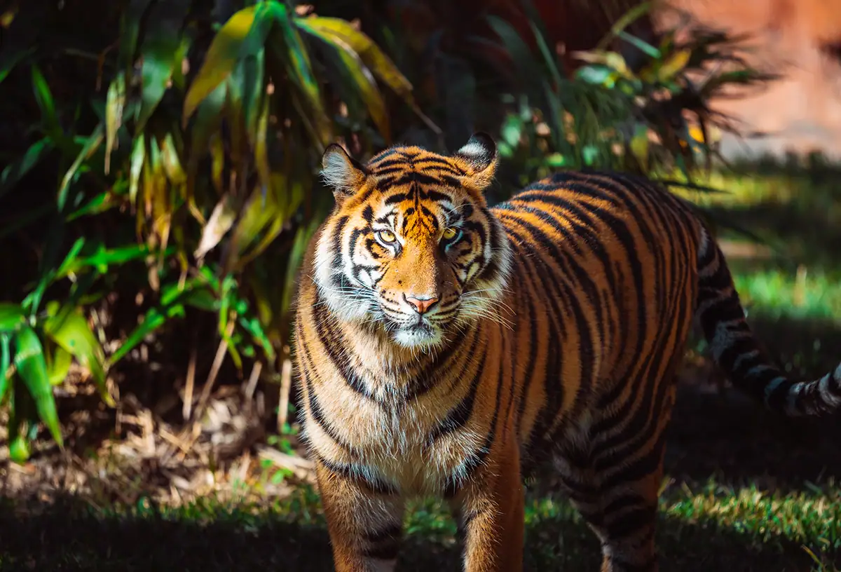Um gafanhoto com o corpo coberto por pequenas gotas de orvalho que brilham com os primeiros raios de sol.