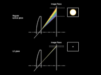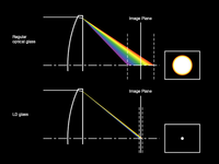 O vidro óptico normal tem um índice de dispersão de cores relativamente alto, o que faz com que as bordas da imagem fiquem coloridas.