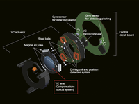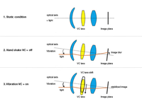 O mecanismo VC inclui um elemento de lente VC que se move paralelamente ao plano da imagem meramente por meio de controle eletrônico (veja a ilustração 1). A unidade de bobina de acionamento inclui um detector de posição que avalia a respectiva posição do elemento VC e informa à unidade de controle. O elemento VC tem três ímãs que são acionados por bobinas de acionamento correspondentes. Na unidade de controle, estão instalados dois sensores giroscópicos, que captam as vibrações horizontais e verticais e as informam ao microprocessador. O elemento VC é de flutuação livre (dois graus de liberdade e paralelo ao plano da imagem) e, portanto, pode compensar as vibrações em todas as direções.