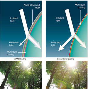 O revestimento eBAND consiste em uma nanoestrutura fina como uma bolacha (1 nm = 1/1.000.000 mm) com um índice de refração extremamente baixo. Em combinação com o multi-revestimento subjacente, obtém-se um efeito antirreflexo excepcional.